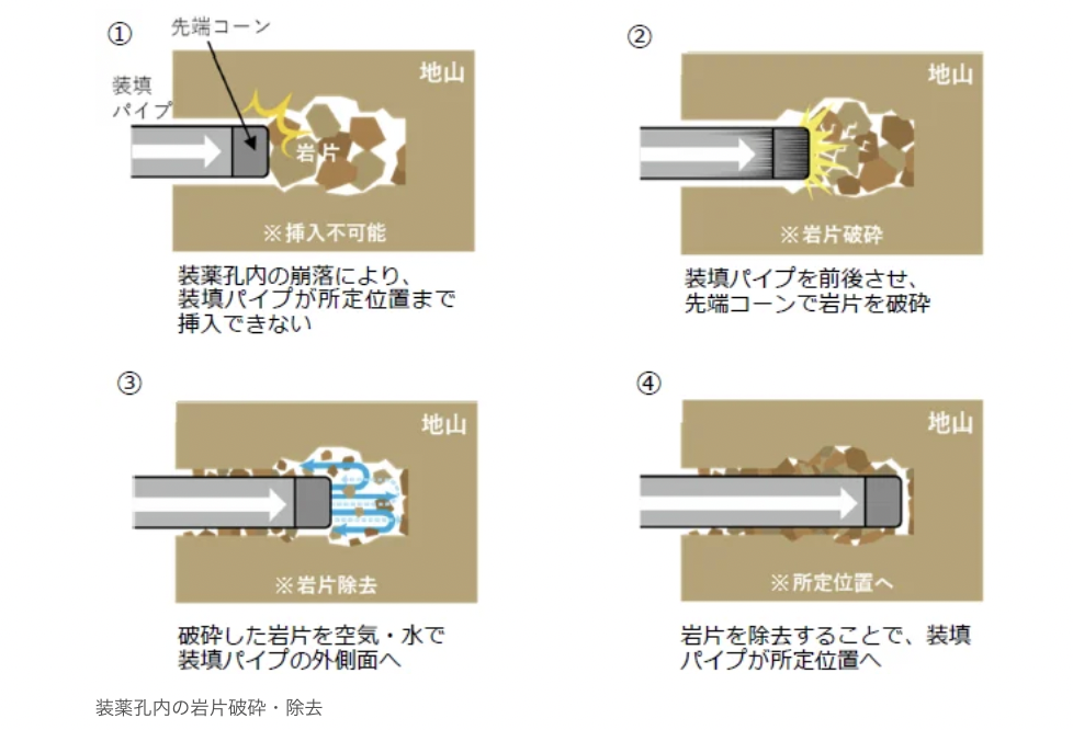 - 崩落への対応: 装置先端にステンレス製の「コーン」を装備。穴が岩片で閉塞していても、これを破砕・除去して装填パイプを挿入できる。