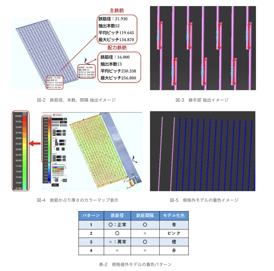 - 規格外を可視化: 設計値と照合し、規格外の鉄筋を色分け表示することで、直感的に不具合を把握できる。