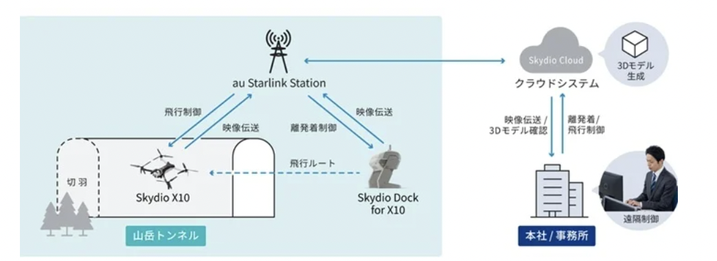 KDDIスマートドローン、KDDI、清水建設の3社は2026年2月9日、北海道七飯町の山岳トンネル建設現場において、衛星通信「Starlink」と自動離着陸ドローンポート「Skydio Dock for X10」を活用した遠隔巡回の実証に成功したと発表した。