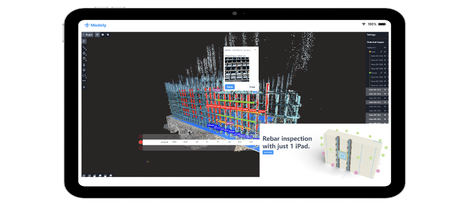 - Modely(モデリー): iPad等のLiDARスキャンを活用した配筋検査システム。写真・動画付きメモ機能や自動サマリー作成により、現場報告を効率化し、クラウド同期で管理者の即時承認を実現する。