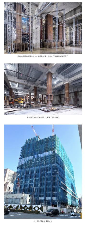 超高層ビルの建て替えでは、地上階の解体と並行して地下階を構築する「逆打(さかうち)工法」が一般的だが、これには新築柱を支えるための「仮設杭」を新たに打設する必要があった。