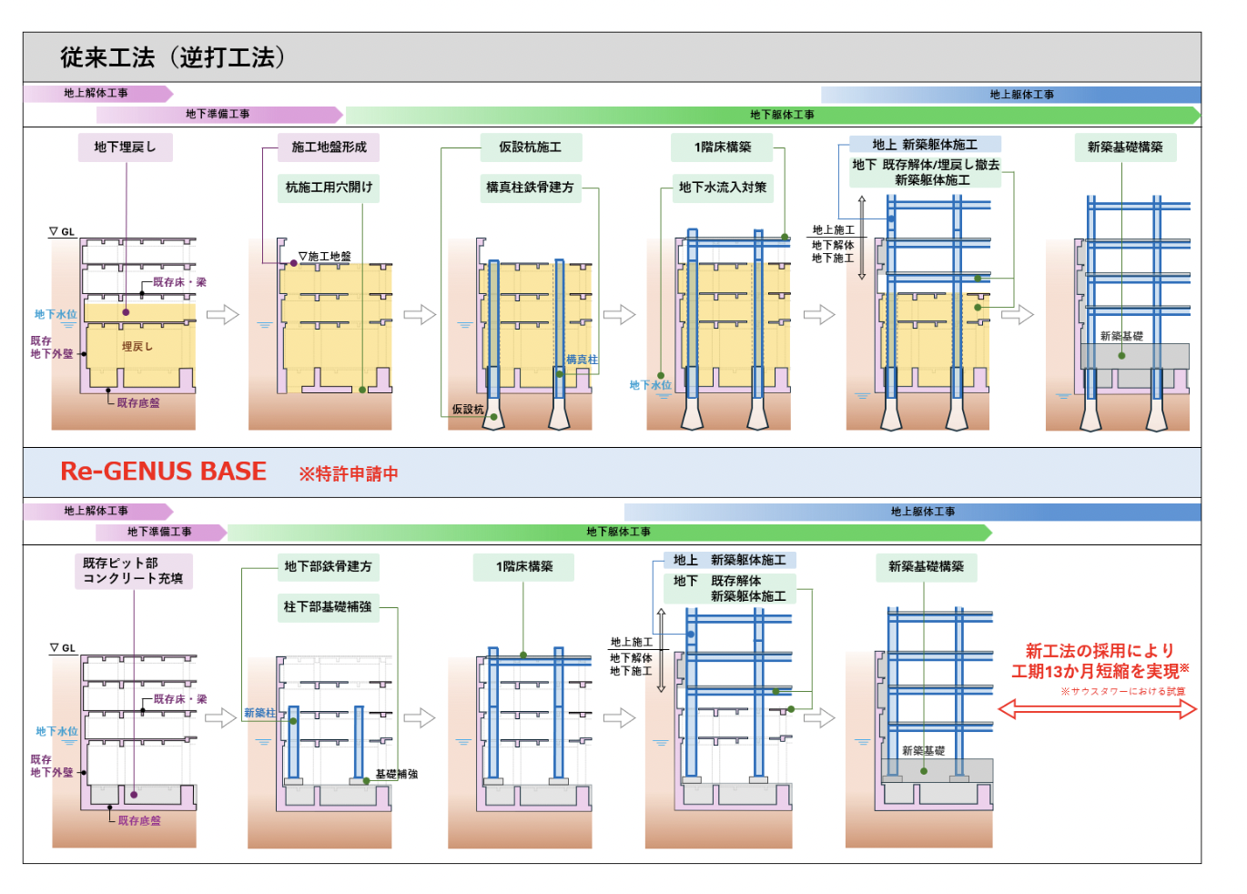 清水建設は2026年2月、既存の超高層ビルの地下構造体を活用することで、建て替え工事の工期を大幅に短縮する新工法「Re-GENUS BASE(リジェナス・ベース)」を開発・実用化したと発表した。