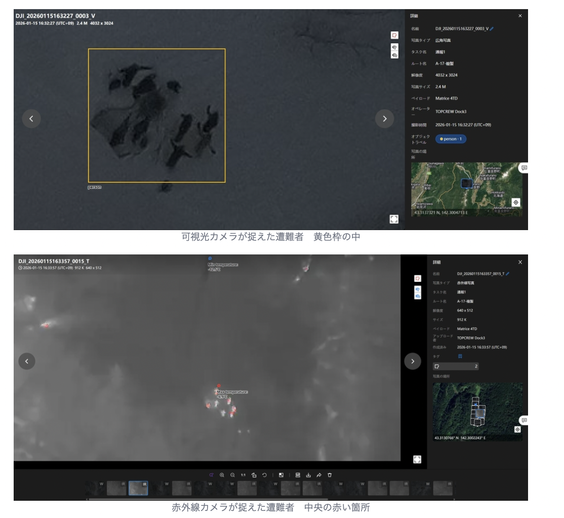 赤外線カメラを搭載したドローンは、真っ暗な雪山の中で遭難者の熱源を検知し、可視光カメラでその姿を捉えることに成功した。