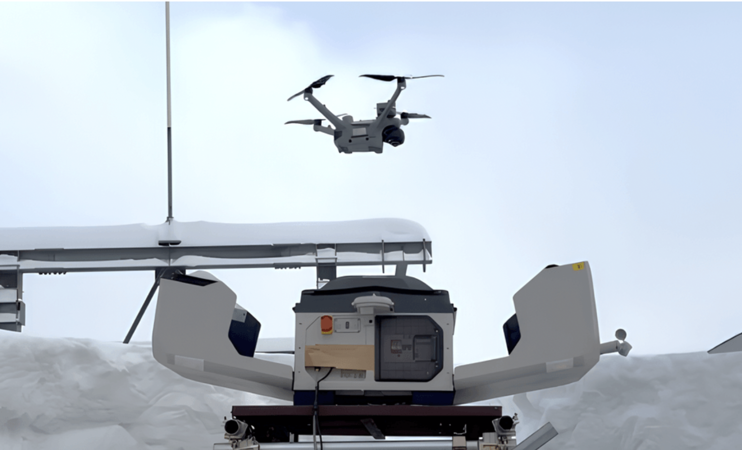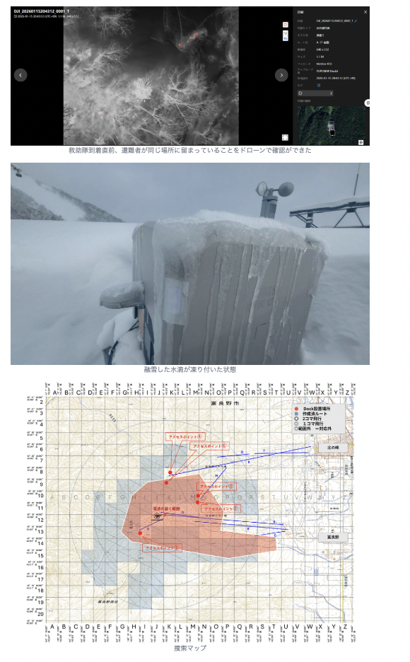 現地の要請を受け、東京のオペレーションセンターから遠隔指令を送信。富良野スキー場のゴンドラ駅舎に設置されたドローンポートからドローンが自動離陸し、遭難者の携帯電話の位置情報を元に捜索を開始した。