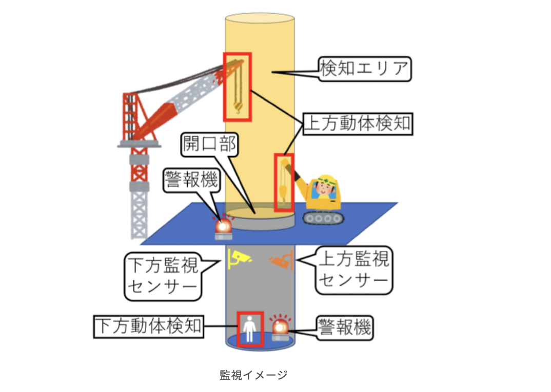 建設現場の開口部(床や道路の穴)を通じて資材を上下させる際、上での「荷下ろし」と下での「作業」が同時に行われている危険な瞬間だけをピンポイントで検知し、警報を鳴らす仕組みである。