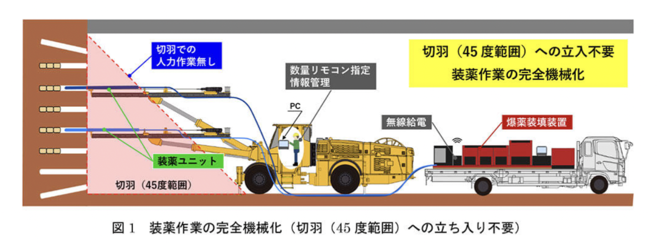 この「装薬」の工程は、これまで作業員が切羽の直下に入り、手作業で行う必要があったため、岩盤崩落(肌落ち)による災害リスクと常に隣り合わせであった。