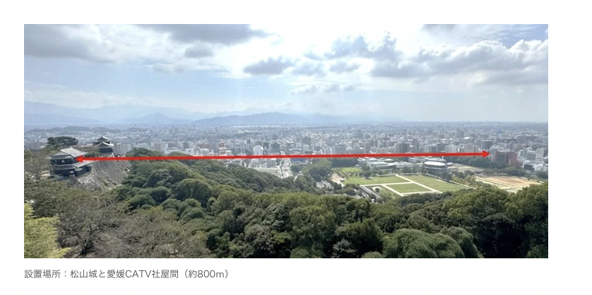 重要文化財である松山城とCATV局舎を結ぶ通信網として採用され、景観保護のために光ファイバの敷設が困難な場所における「見えない光のケーブル」として稼働を開始した。