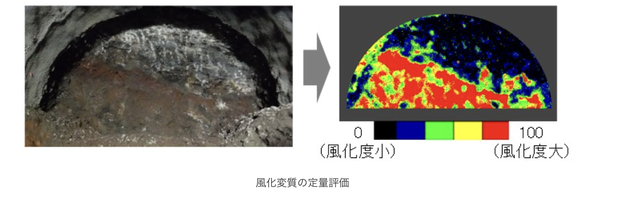これらのデータを独自の分析ソフトやAIで処理することで、「風化変質」「割れ目性状」「走向・傾斜」「圧縮強度」「湧水量」という5つの重要項目を、直接的・物理的なデータに基づいて客観的かつ定量的に評価する。