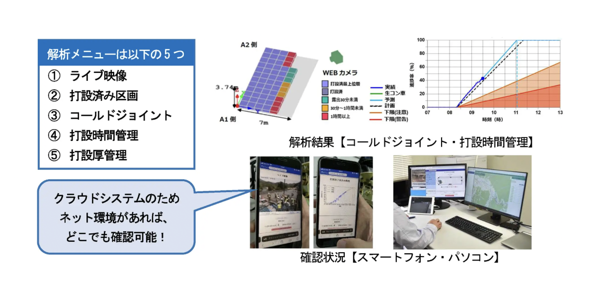 今回導入されたシステムは、現場に設置したWEBカメラの映像やセンサーのデータをクラウド上のAIが解析し、作業員の動きや打設状況をグラフや図表として可視化する仕組みだ。