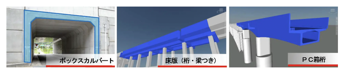本システムは現在、床版、橋脚、フーチング、深礎杭、中層梁などの構造物に対応しており、ボックスカルバートや床版(桁・梁つき)、PC箱桁などへの適用も現在開発が進められている。