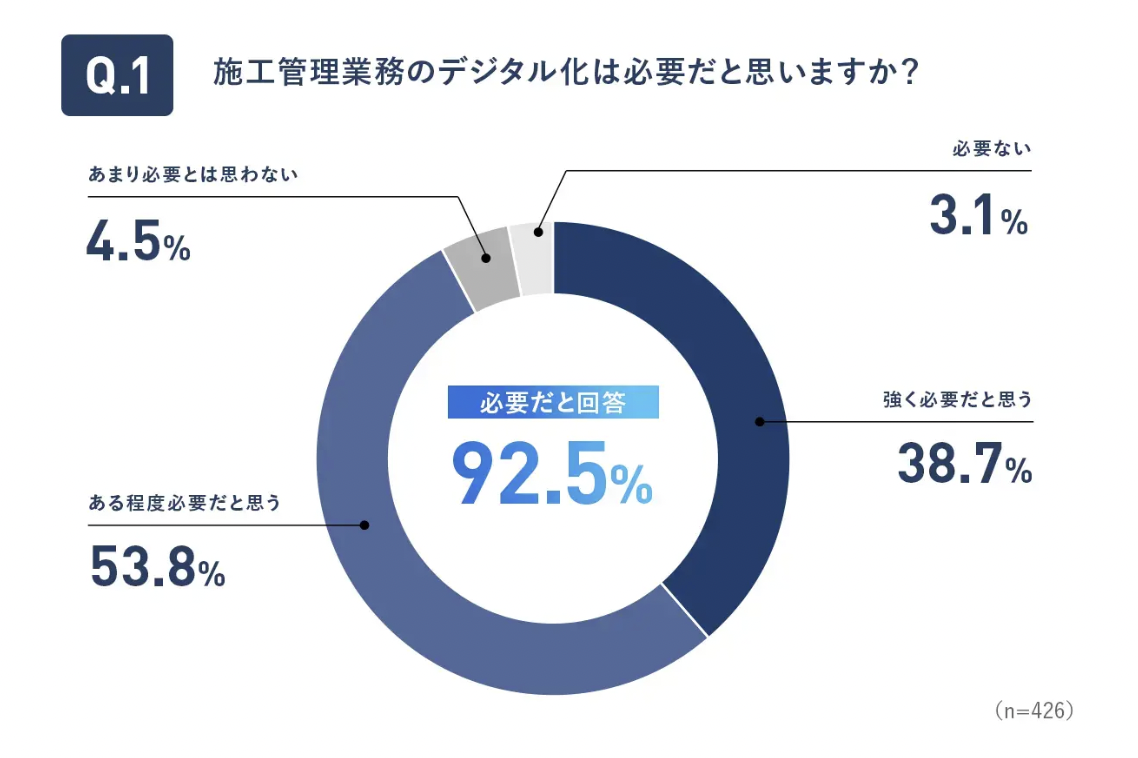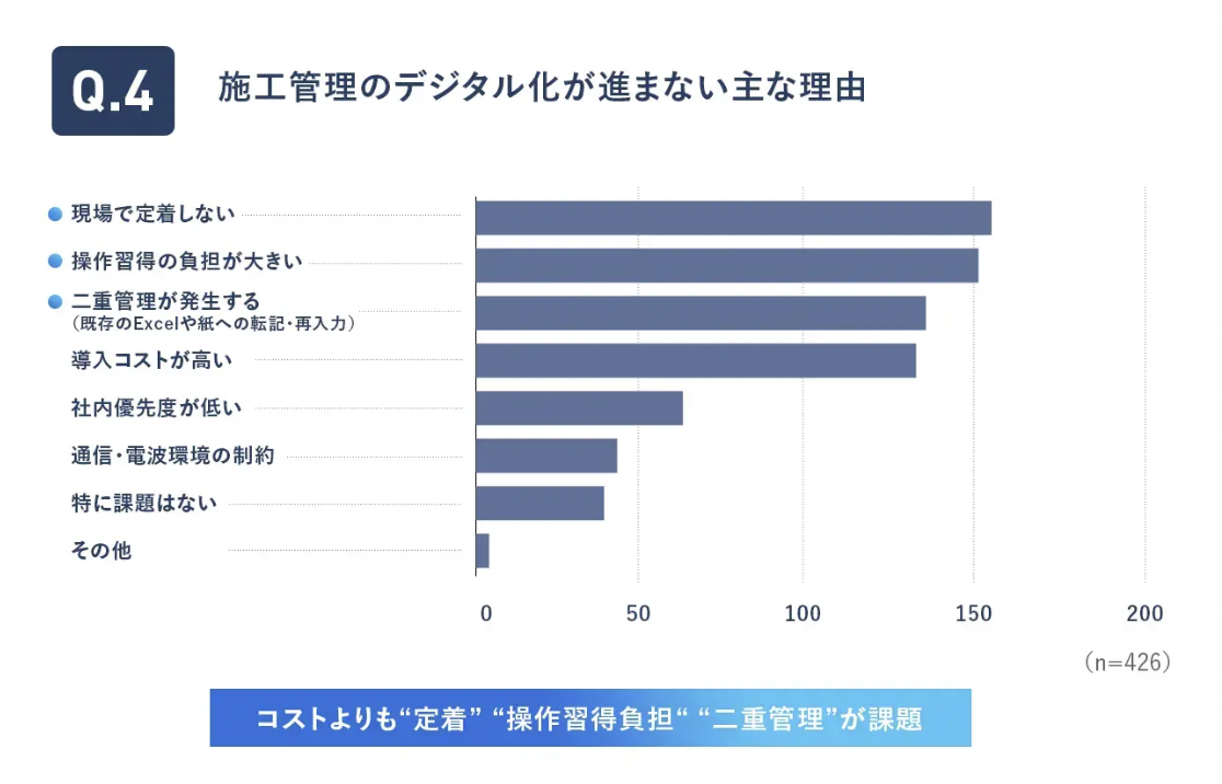 建設業向け情報メディア「現場TECH」を運営する合同会社ソウルグッドは2026年3月24日、建設業従事者426名を対象に実施した「施工管理DX実態調査」の結果を公表した。