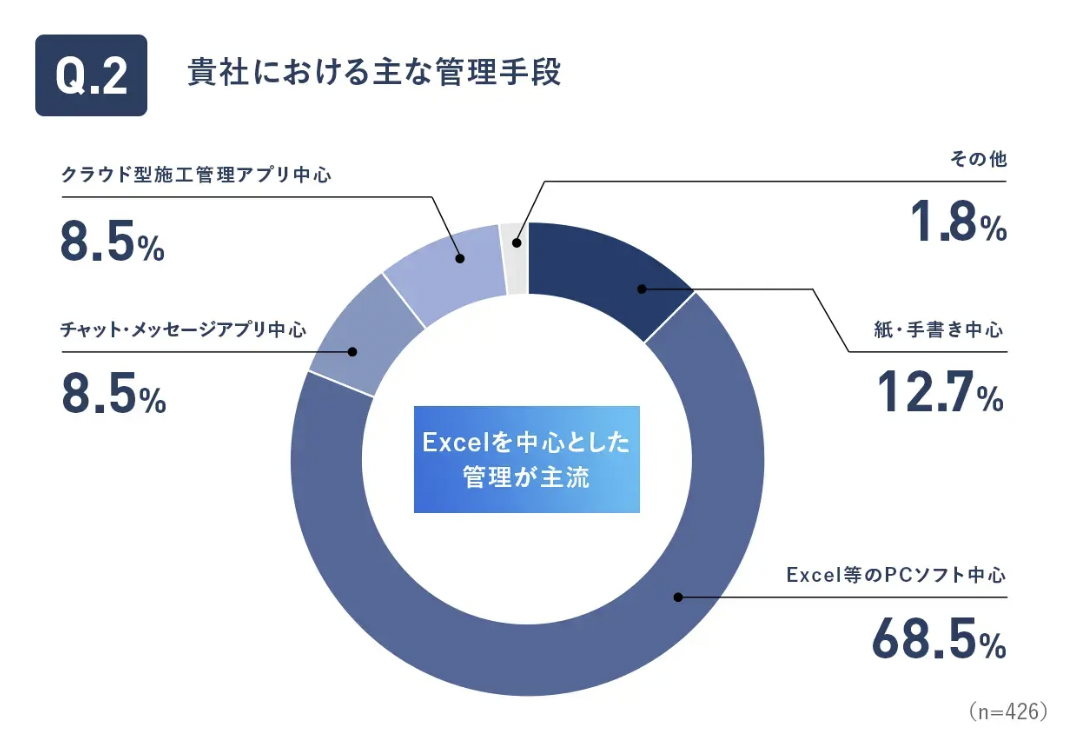 調査で特に注目されるのは、施工管理アプリを導入済みの企業であっても、62.5%がExcelを中心とした運用を続けているという結果だ。