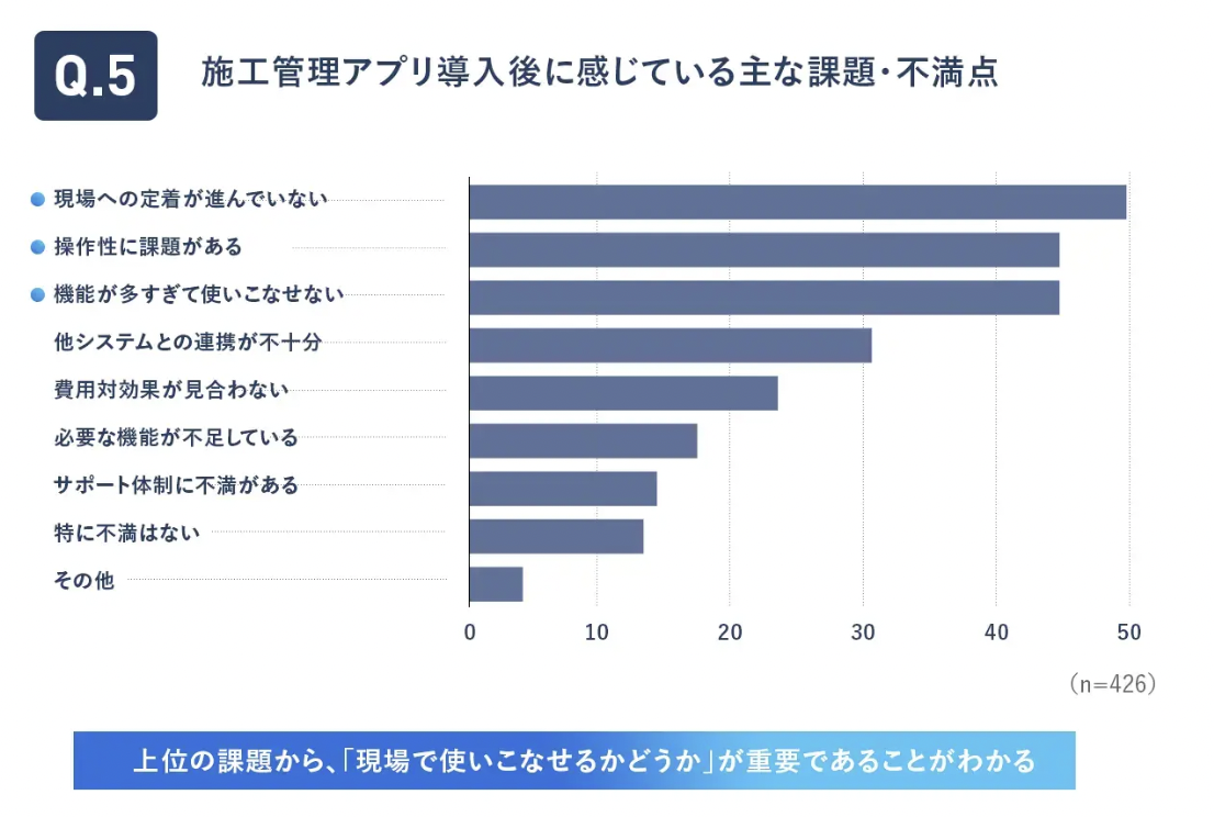 施工管理アプリを導入済みの企業に不満点を聞いた設問でも「現場への定着が進んでいない」(36.0%)が最多で、「機能が多すぎて使いこなせない」「操作性に課題がある」(各32.4%)が続いた。