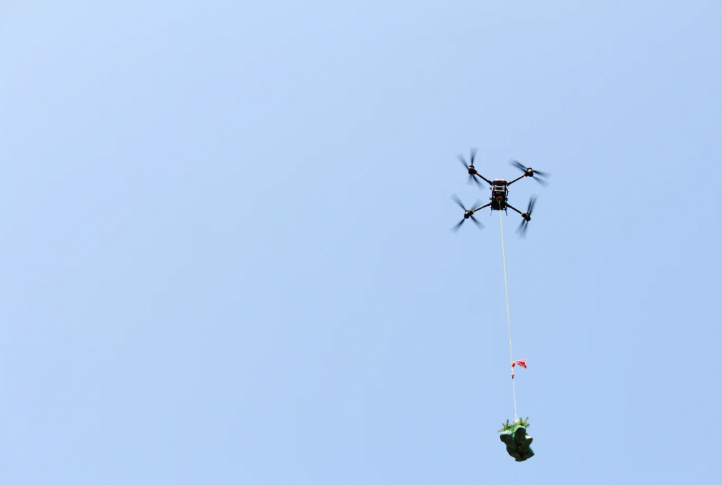 架線・延線工事での資材運搬から山間部での植林苗木搬送まで、人力や重機では困難な現場の搬送作業をドローンで代替する。
