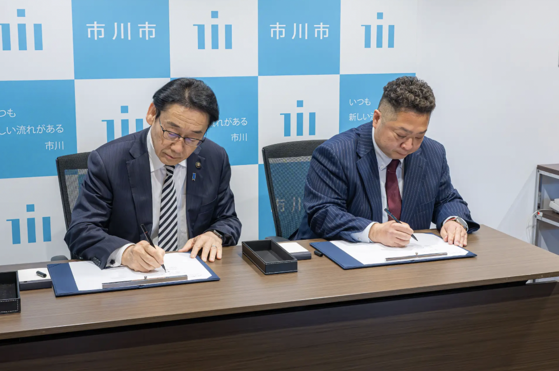 協定締結式は市川市役所で行われ、田中市長とマルソク代表取締役が協定書に署名した。