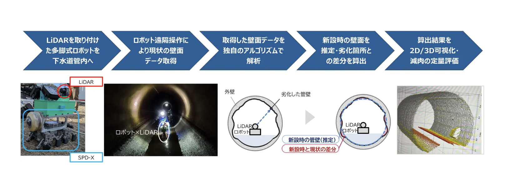 テムザックが開発した多脚式ロボット「SPD-X」にLiDARを搭載して管内の点群データを取得し、NTTドコモソリューションズ独自のAI技術(特許出願中)で腐食劣化による「減肉」の深さと範囲を定量的に把握することに成功した。