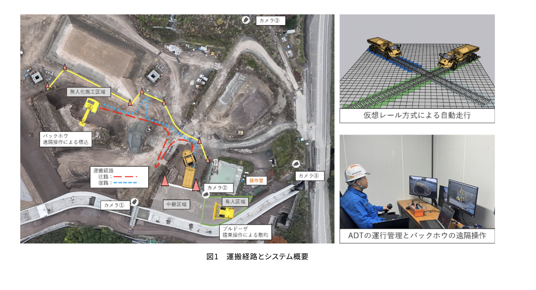 実証実験では自動走行ADT1台、遠隔操作バックホウ1台、搭乗操作ブルドーザ1台の計3台を連携させた。