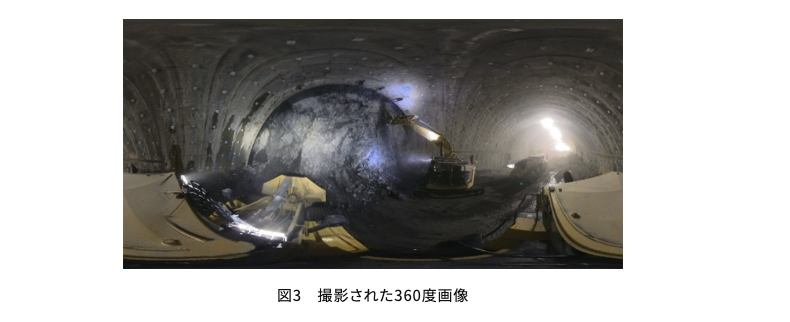 重機に360度カメラを搭載し、走行しながら自動撮影。切羽撮影時間を実質ゼロに