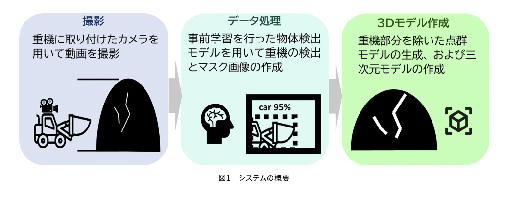 撮影された画像はAIで処理され、映り込んだ重機部分を深層学習で自動検出・消去したうえで、SfM(Structure from Motion)による3次元モデル生成に使用される。