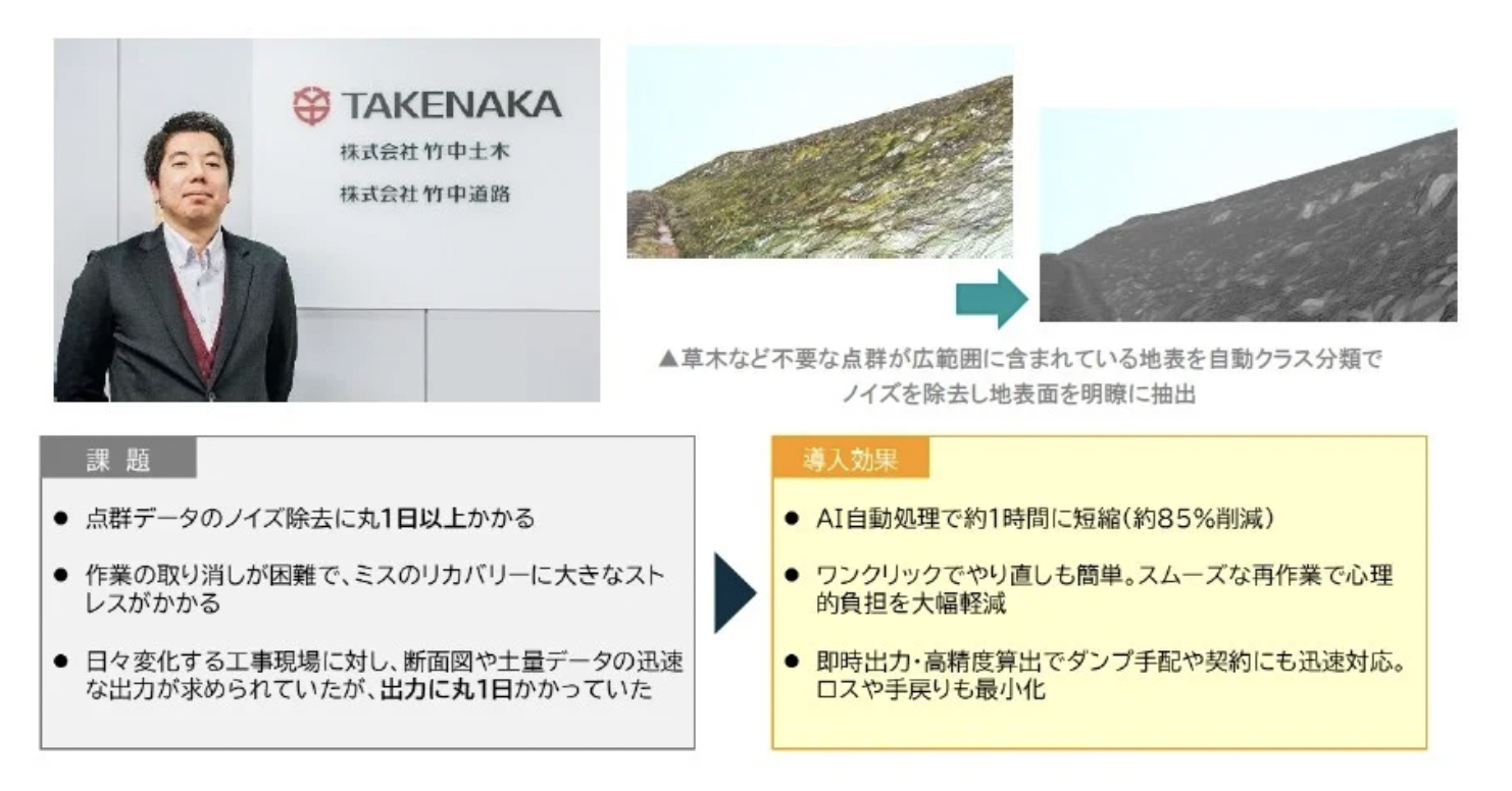 竹中土木では、従来丸1日以上かかっていた草木などのノイズ除去をAIが自動処理することで工数を85%削減し、1時間での処理を実現した。