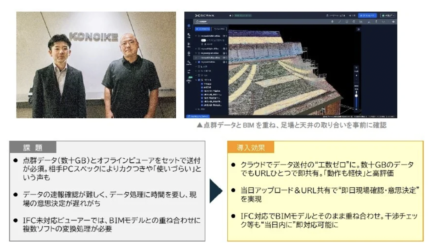鴻池組では数十GBの点群データをURLひとつで伝達できる環境を構築し、現場への速報共有から施工計画の事前検討まで活用の幅を大きく広げている。