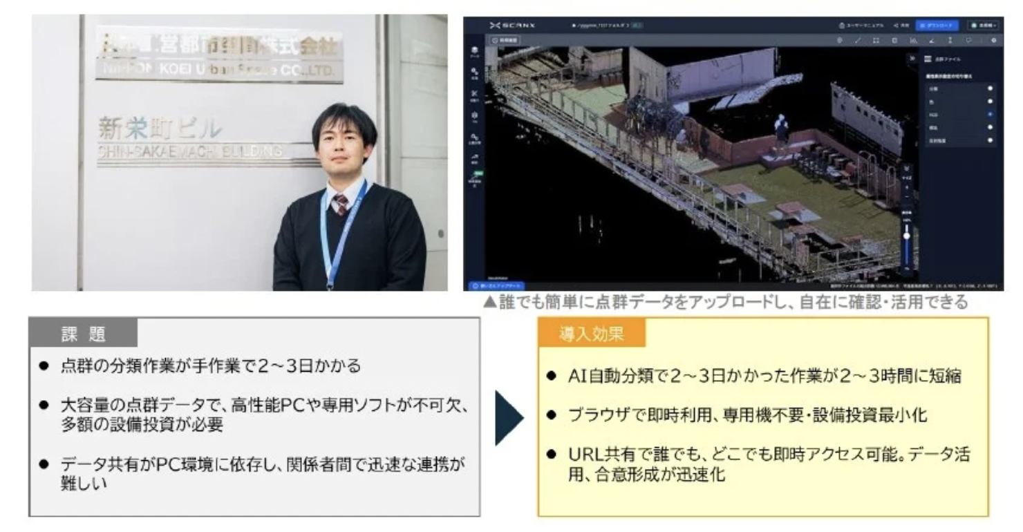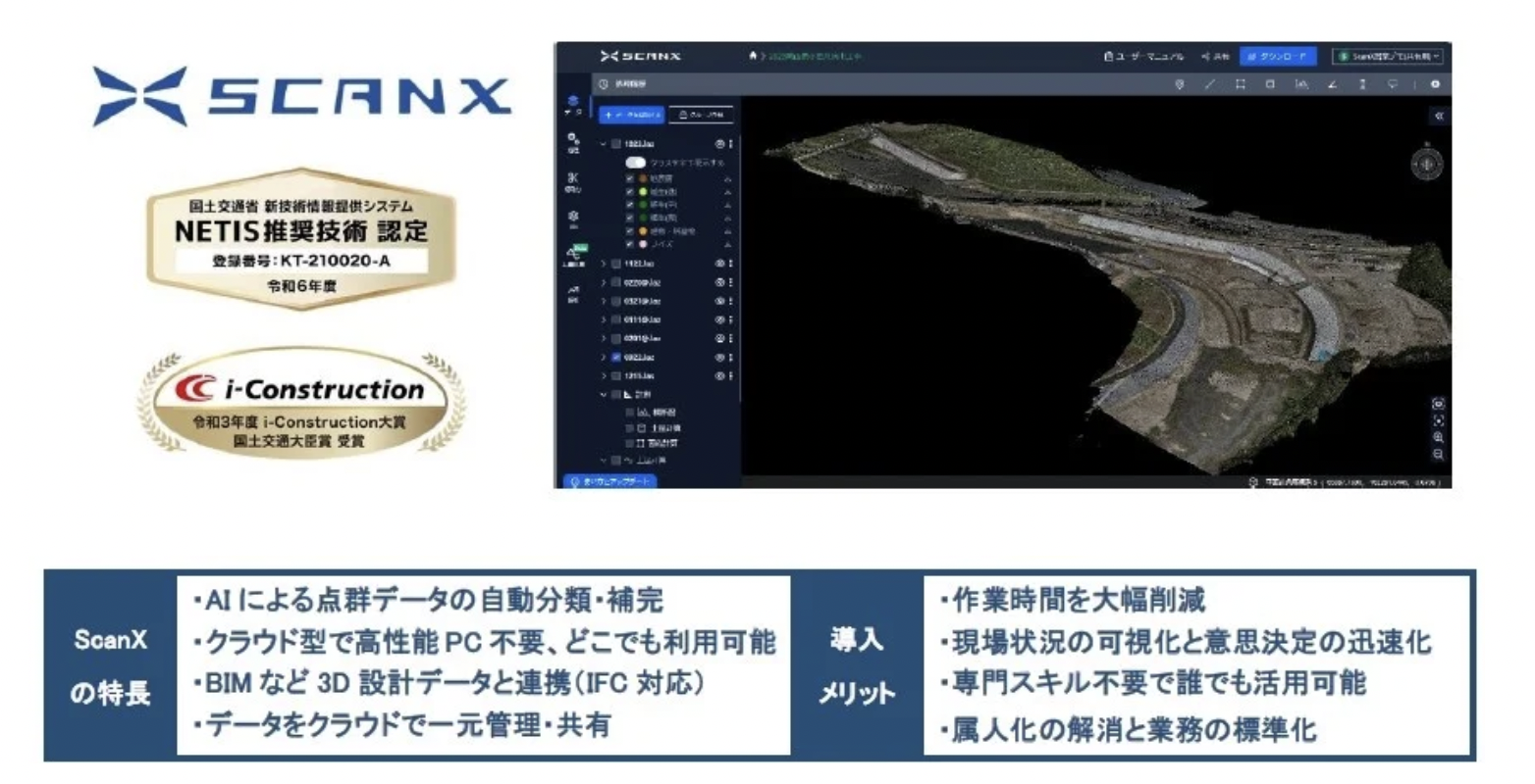 ScanXは3次元点群データをAIで自動分類し、3D設計データなどと重ね合わせて現場の状況解析や工事進捗管理を効率化するクラウド型サービスだ。