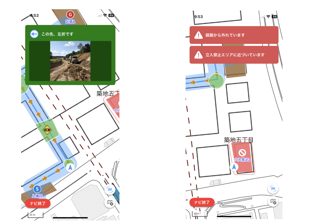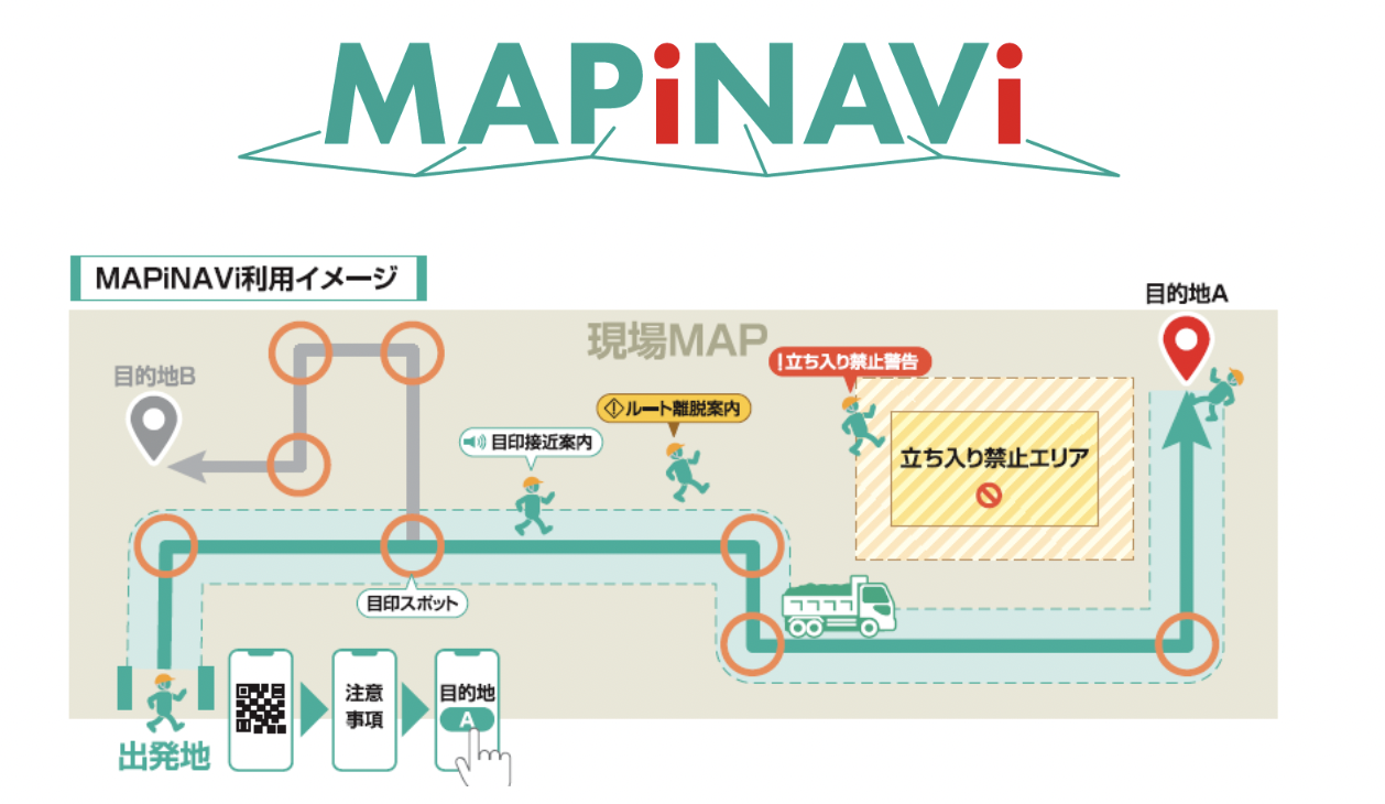 安全機能として、現場ごとに異なる「現場注意事項」を確認しなければナビゲーションが始まらない仕組みも採用されており、新規入場者が立入禁止エリアや重機通行エリアへの侵入リスクを事前に認識できる設計となっている。