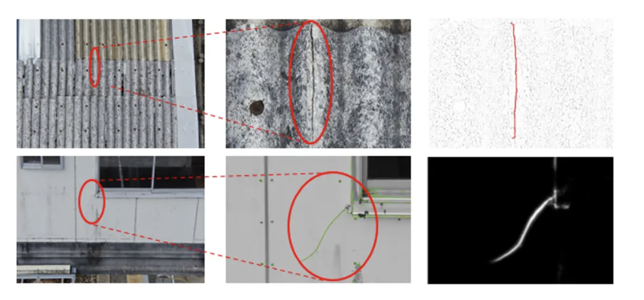 外壁のひび割れ検出では、初期解析でひび割れを含む変状箇所を大まかに抽出したうえで追加の解析処理を組み合わせることで、検出精度のさらなる向上が確認された。