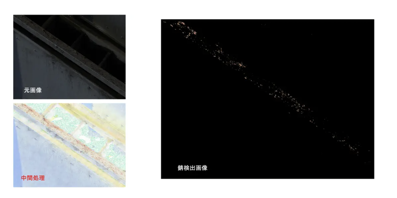 コントラスト補正で暗部の錆も検出。ひび割れも追加解析処理で検出精度を向上