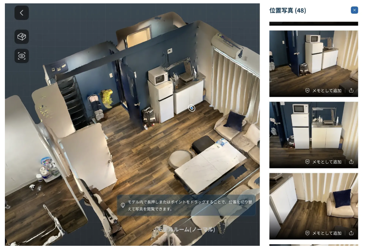 機能の仕組みはシンプルで、ユーザーが3Dモデル上の気になる箇所をクリックすると、その位置が写り込んでいる写真が瞬時に一覧表示される。