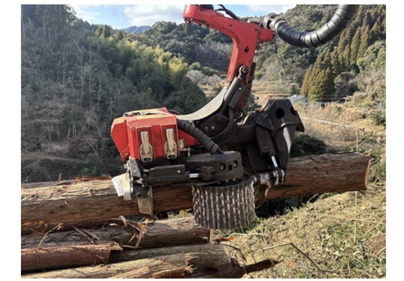 曲がり材にも対応しやすく木材へのダメージが少ない設計となっており、3つの機能が林業施業の効率を高める。