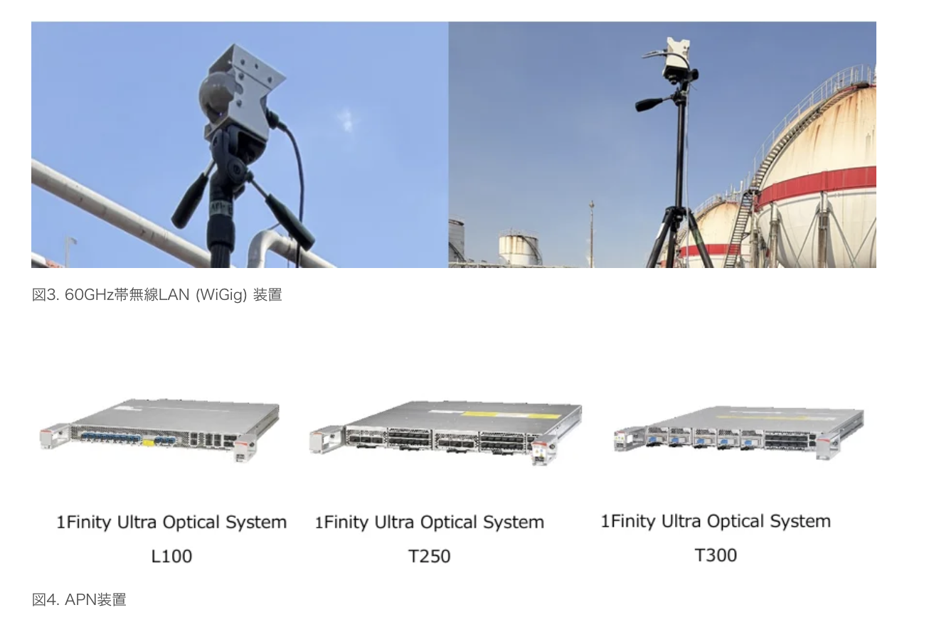 この2つを組み合わせた4Kカメラ8台(合計約400Mbps)の映像データ同時伝送では、約2kmの無線区間と往復約1,400kmのAPN通信区間を通じてエンド・ツー・エンドで0.1秒未満の低遅延でのデータ伝送を確認した。
