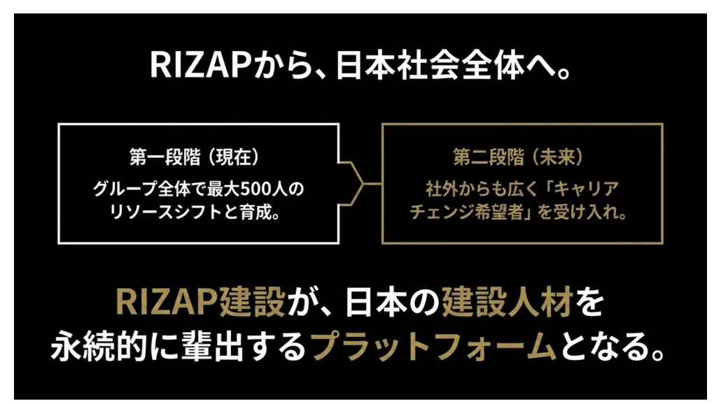 2040年には建設業界で約122万人が不足すると予測される中、RIZAPグループはAI活用による業務効率20%以上向上で生み出したリソースを最大500人規模でRIZAP建設へシフトし、技能・資格取得を全面支援するリスキリングプログラムを展開する。