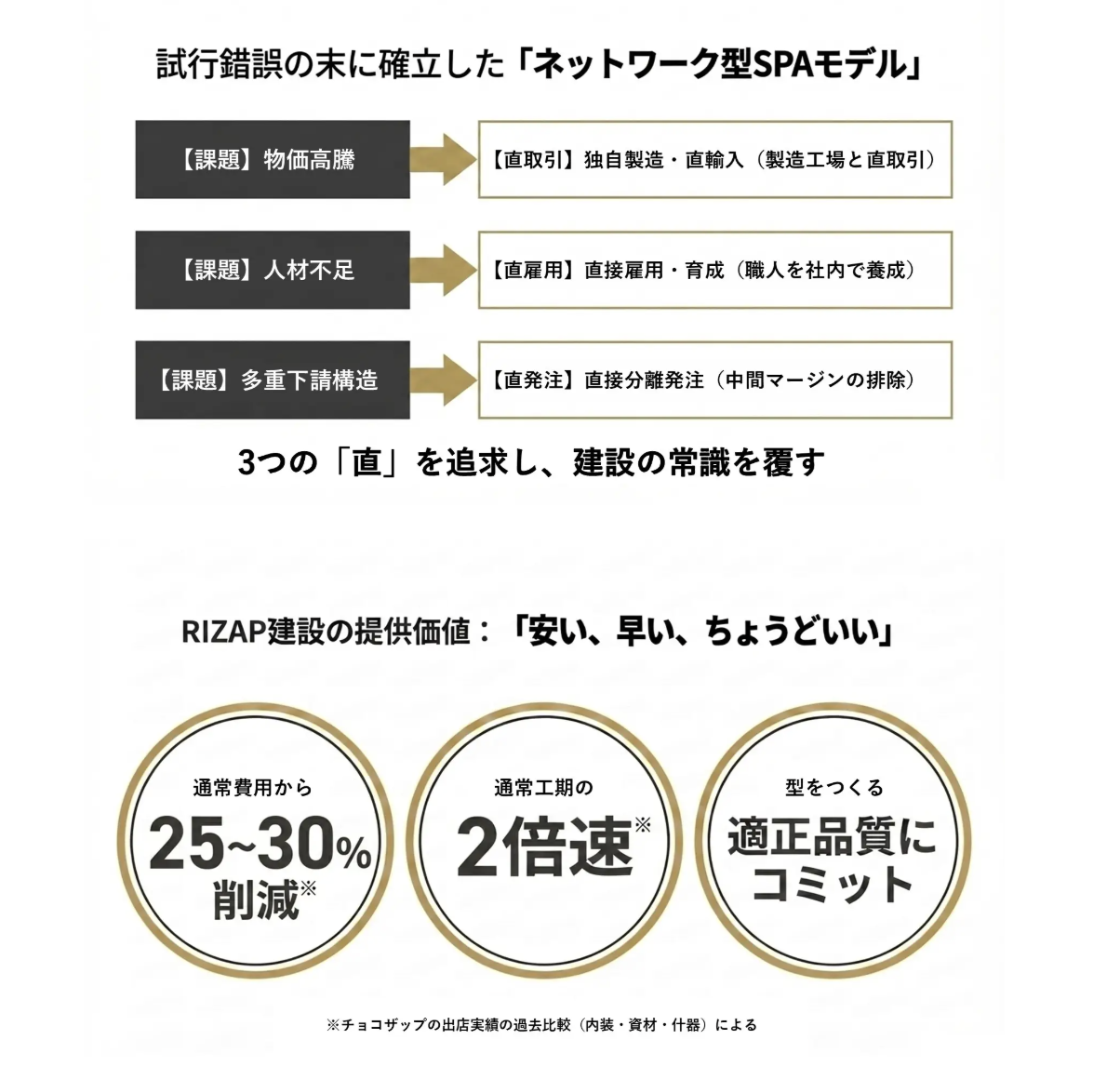 製造工場との直取引による中間コスト削減、職人を社内で養成する直雇用による現場の機動力最大化、従来の多重下請け構造を排除する直発注によって、通常比25〜30%のコスト削減と通常工期の2倍速を実現した(チョコザップ出店実績との過去比較)。