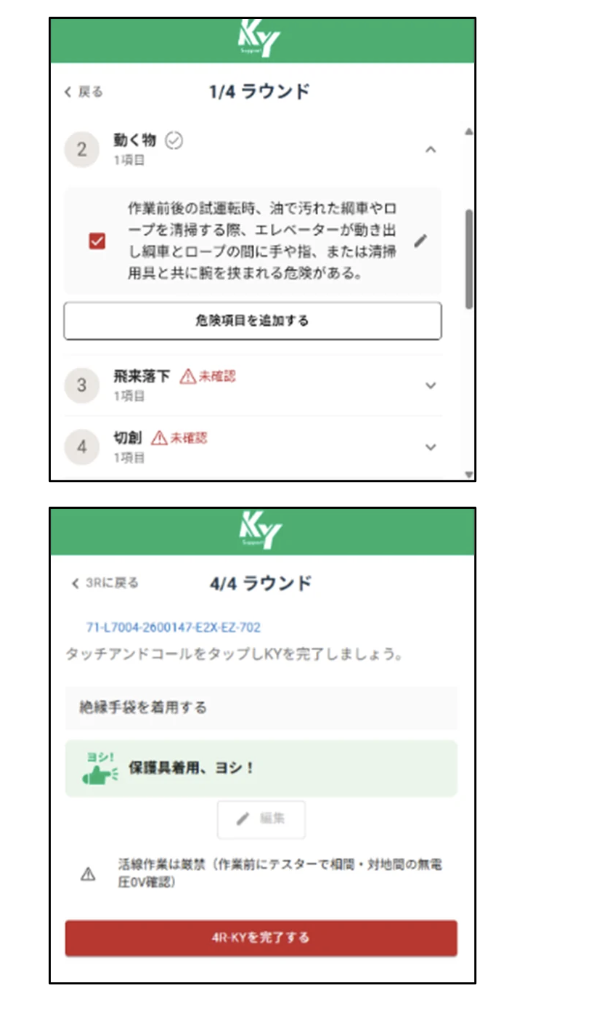 KY-Supportは、KY活動の基本手法「4ラウンド法(現状把握・本質追究・対策樹立・目標設定)」のステップをアプリ内で完結させる設計だ。