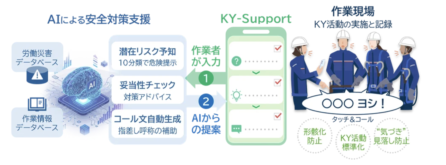 4ラウンド法の全ステップをアプリ上で再現。AIが潜在リスクの提示から行動目標の文言改善まで一貫サポート