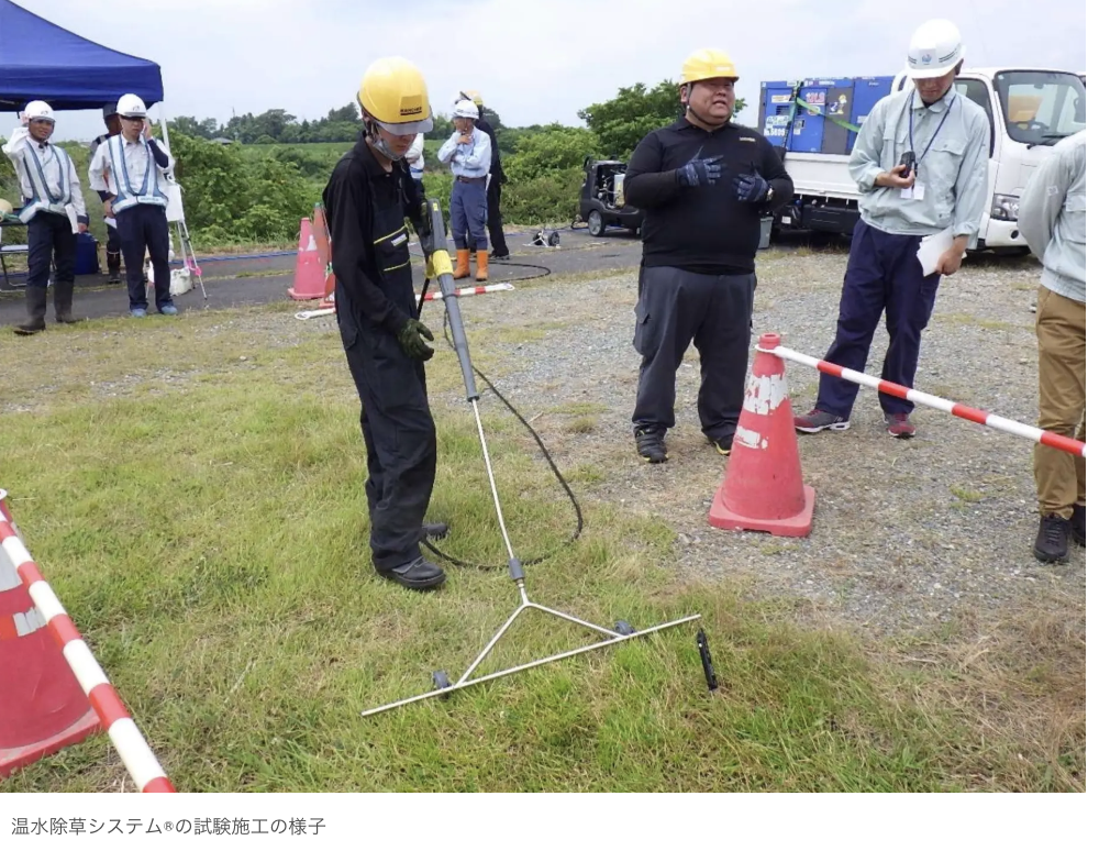 温水除草システム®は100℃近い高温水を雑草に散布して根のタンパク質構造を変異させ根から枯らす技術で、除草剤・農薬を一切使用しない。