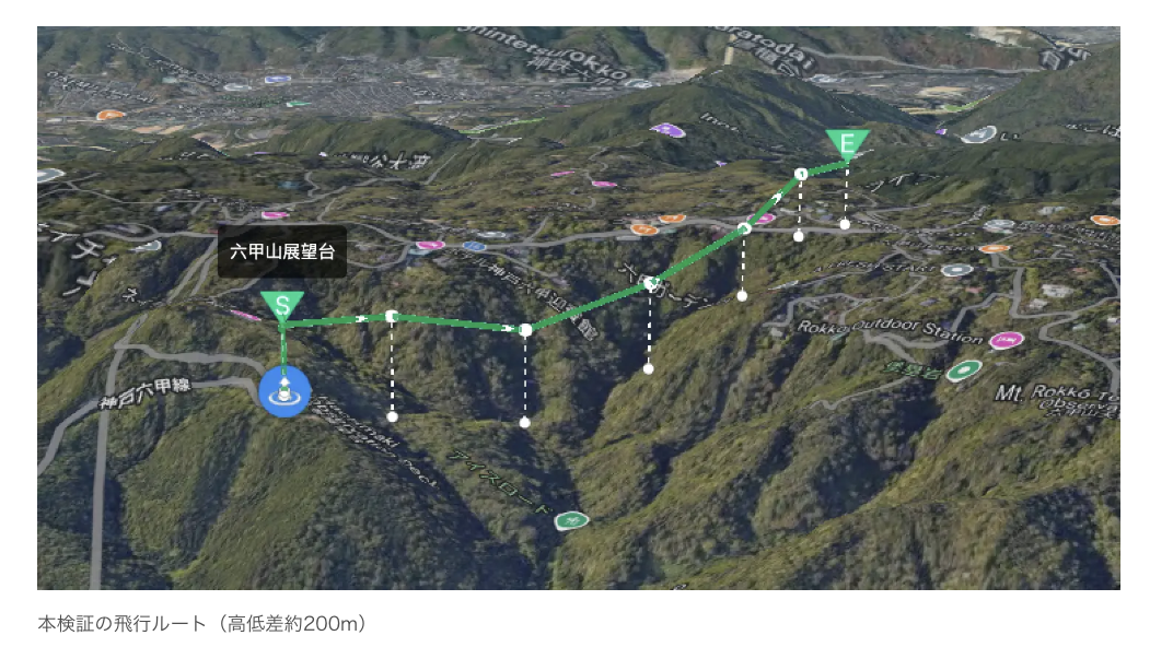 単なる飛行検証や物流実験ではなく、実災害時にそのまま接続し得る運航モデルの構築を目的とした実証で、高低差約200mのルートをレベル3.5飛行・LTE電波活用の条件で実施した。