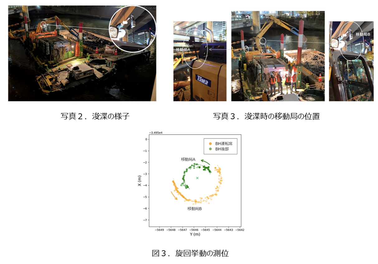 追尾した通船の軌跡はレーザー測量結果とほぼ一致し、所定の測位精度が得られることを確認。また、浚渫作業を行う台船上のバックホウのブーム旋回状況についても連続的かつ安定した追尾に成功した。