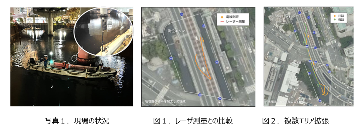 実証では首都高架橋下に基準局を12か所設置し、日本橋川を行き来する通船(移動局)の追尾試験を実施した。