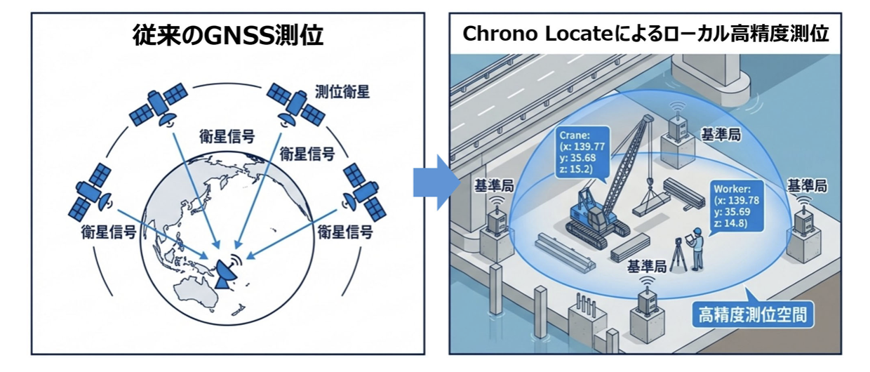 ナノ秒精度の時刻同期×双方向通信でセンチメートル級測距。「地上に展開したローカルGPS」として機能