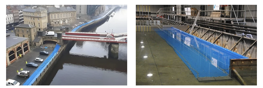 (左:英国のニューカッスルの河川沿いで、実際に運用された実績/右:製品テストの様子。様々な水位で繰り返しテストが行われた)