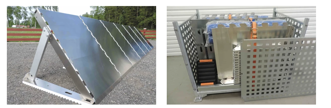 (左:INERO止水板。特別な知識がなくても簡単に設置可能/右:止水板は専用の保管ボックスに立てて収納)2〜3人で1時間に最大100mを設置可能で、特許取得のクイックコネクターにより工具不要で確実に連結できる。