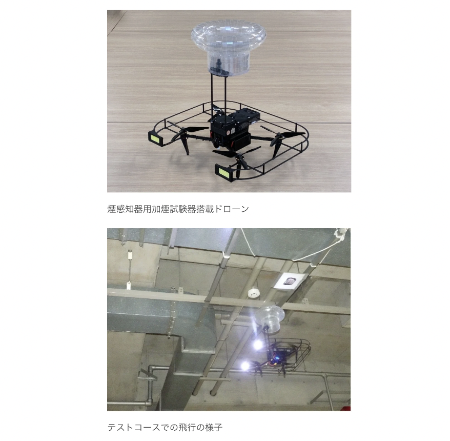 採用事例として、能美防災は煙感知器用加煙試験器搭載ドローンを開発・提供開始している。