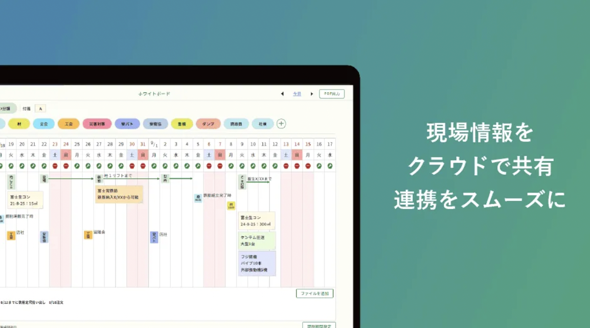 KENTEM-Dashboardは、現場事務所にあるホワイトボードをクラウド上で手軽に作成でき、関係者へスケジュールや状況等を共有することで、現場の作業を円滑に進めることができる。