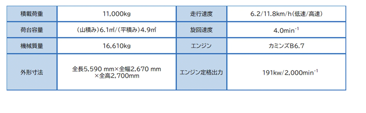 耐摩耗鋼を使用した高強度・大容量の新型荷台を採用し、積載性能を大幅に強化している。積載容量は6.1立方メートル、最大積載荷重は11トン。