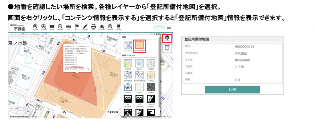 主な検索・閲覧方法として、地番を確認したい場所を検索し各種レイヤーから登記所備付地図を選択、画面を右クリックしコンテンツ情報を表示するを選択すると登記所備付地図情報を表示できる。