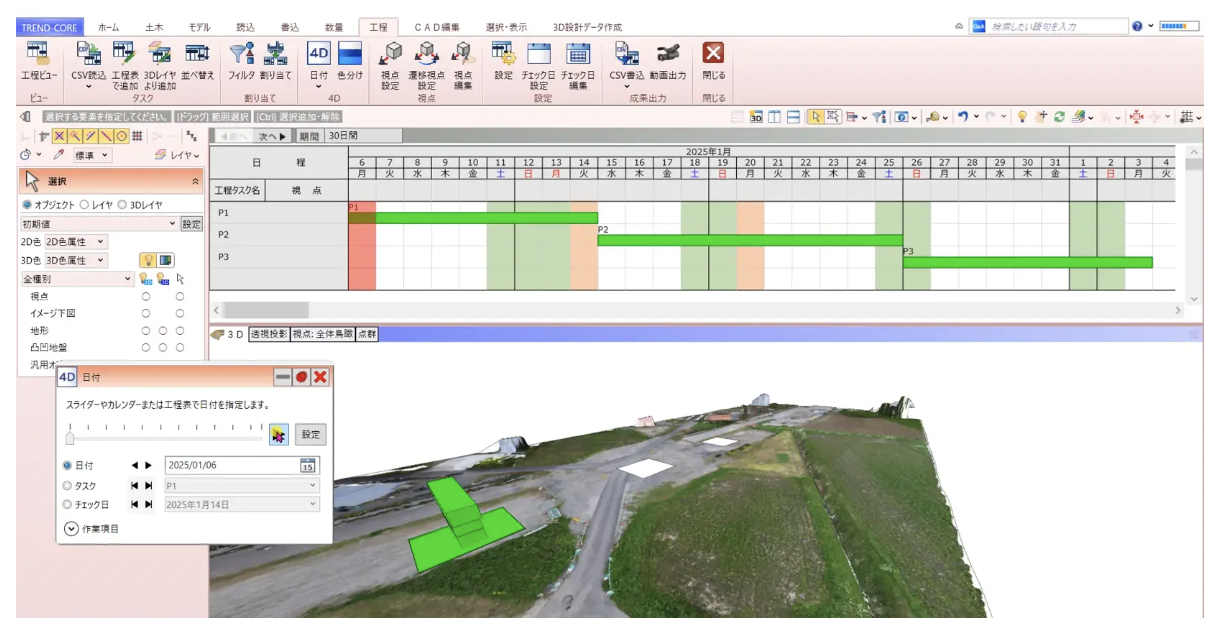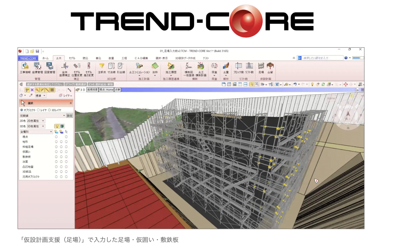 TREND-CORE以外のCADで作成した3DモデルもIFCやLandXML等の形式でデータ取り込みができ、詳細な仮設計画を行うことが可能だ。