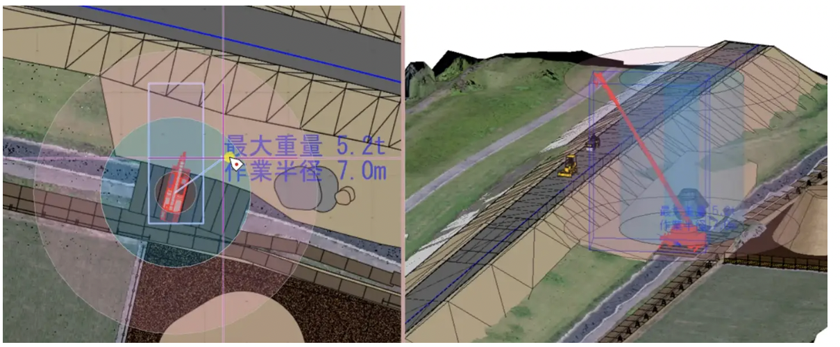 その他、3D部品のクレーンにおける「定格総荷重表にもとづく可動範囲表示」に対応し、吊重量と作業半径の関係を可視化できる機能や、4D施工ステップの改良として視点登録機能、CSV読込改良などが追加された。