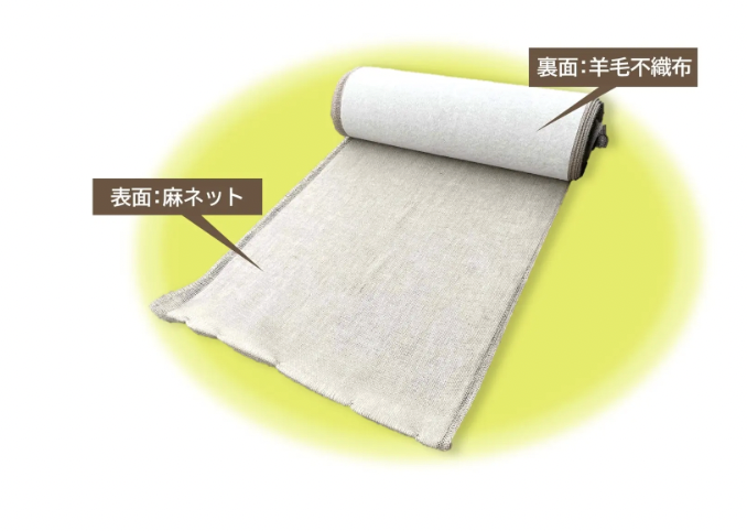 エコシープは、動物性の羊毛不織布と植物性の麻ネットでできており、全ての素材が生分解性の環境配慮型資材である。